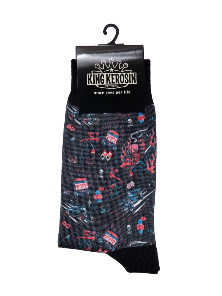 Эти носки King Kerosin перенесут азарт Лас-Вегаса прямо к вашим ногам! Привлекательный дизайн с изображением пин-ап моделей, хот-родов и игровых автоматов создает идеальный рок-н-ролльный образ. Благодаря эластичному и прочному материалу они удобно сидят и сохраняют форму - для настоящих хайроллеров со стилем!
