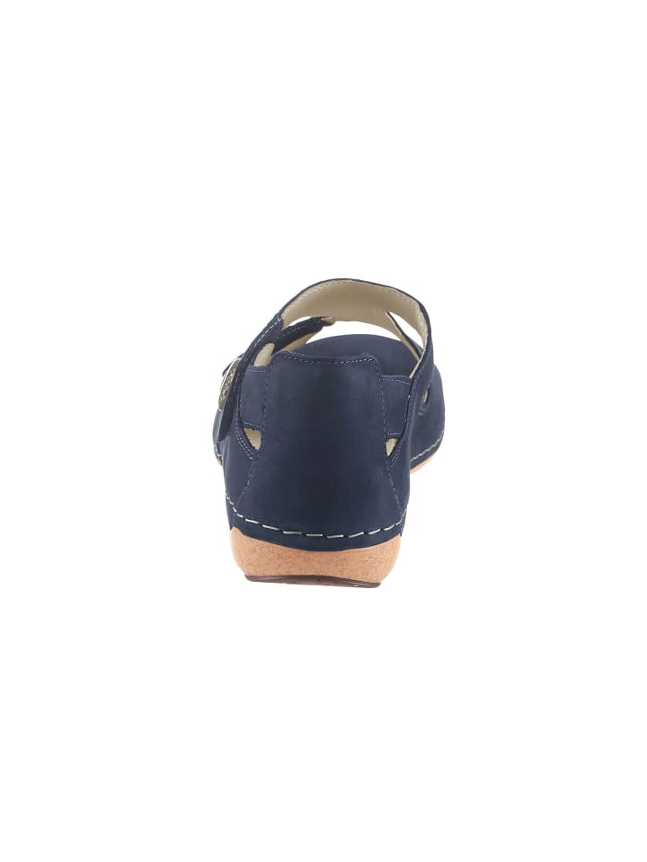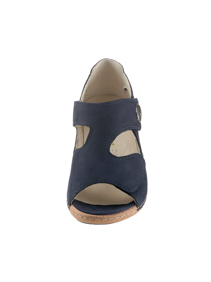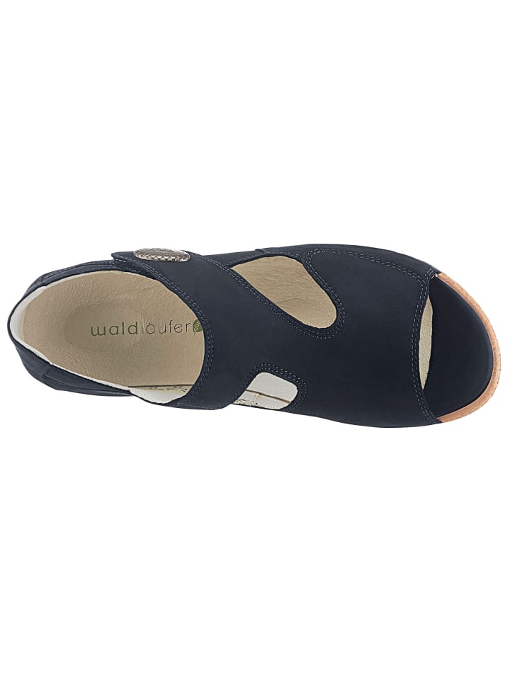 От Waldläufer: Сандалии из нубуковой кожи с высококачественной кожаной подкладкой. Две застежки-липучки и декоративный элемент. Съемная кожаная стелька с плюсневой подушечкой и поддержкой свода стопы. Противоскользящая полиуретановая подошва с имитацией пробки. Каблук около 25 мм. Ширина В.