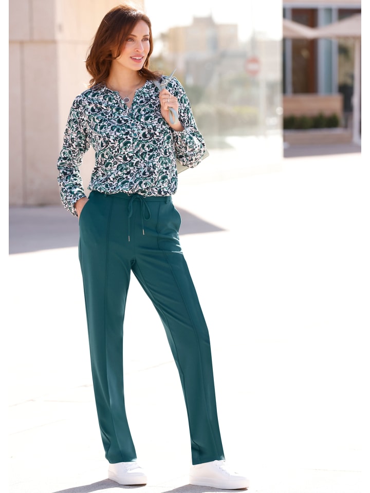 Трикотажные брюки из трикотажной ткани интерлок, сохраняющей форму. Удобный эластичный пояс с петлями для ремня, гладкая передняя панель и затягивающийся шнурок. Вытачки сзади для придания формы. Два передних кармана. Складки спереди создают эффект удлинения штанины. Ширина штанины внизу около 38 см. Ремень в комплект не входит.