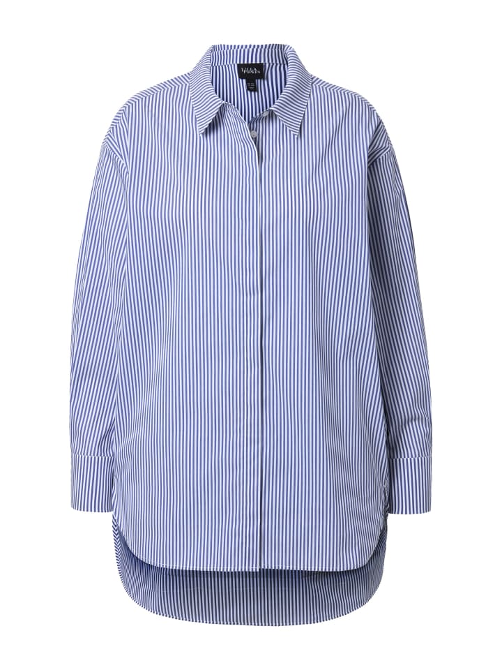 Полосатая блузка свободного кроя с воротником-стойкой, потайной застежкой на пуговицы и подолом с закругленными боковыми разрезами. Длинные рукава с манжетами.
