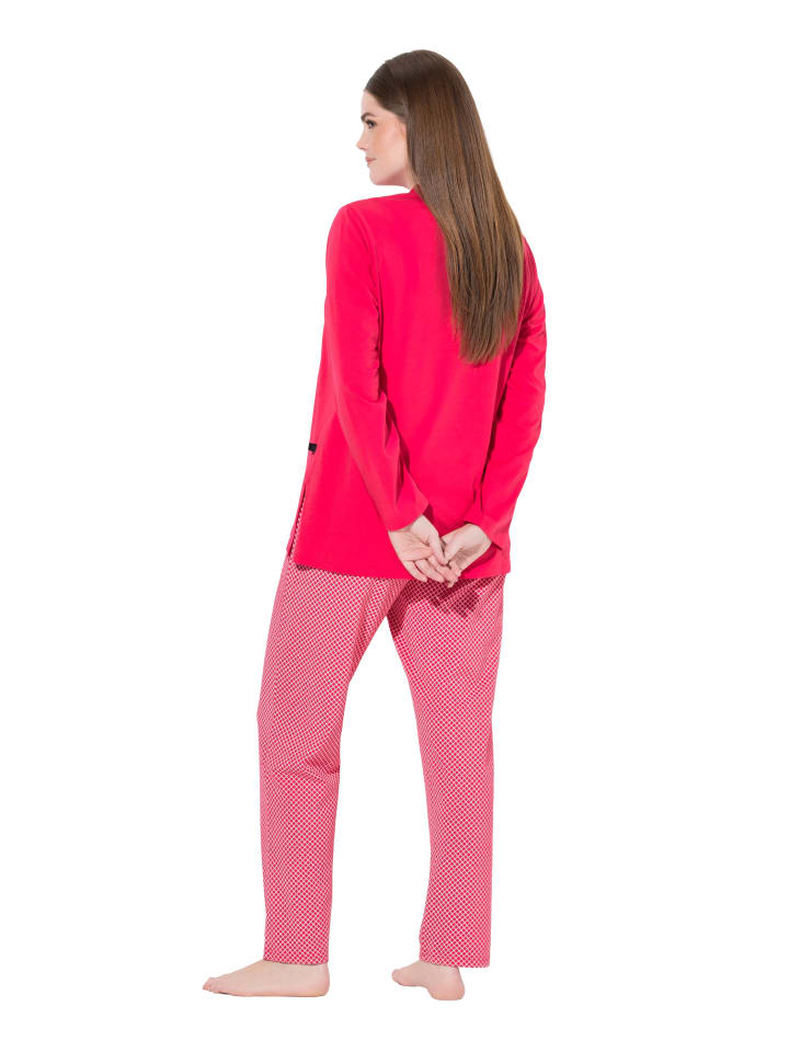 Пижамный комплект из двух частей из мягкого трикотажа. Однотонная футболка с длинными рукавами, круглым вырезом и разрезом. Длинные зауженные брюки с узором, эластичным поясом и боковыми карманами. Сертифицировано OEKO-TEX.