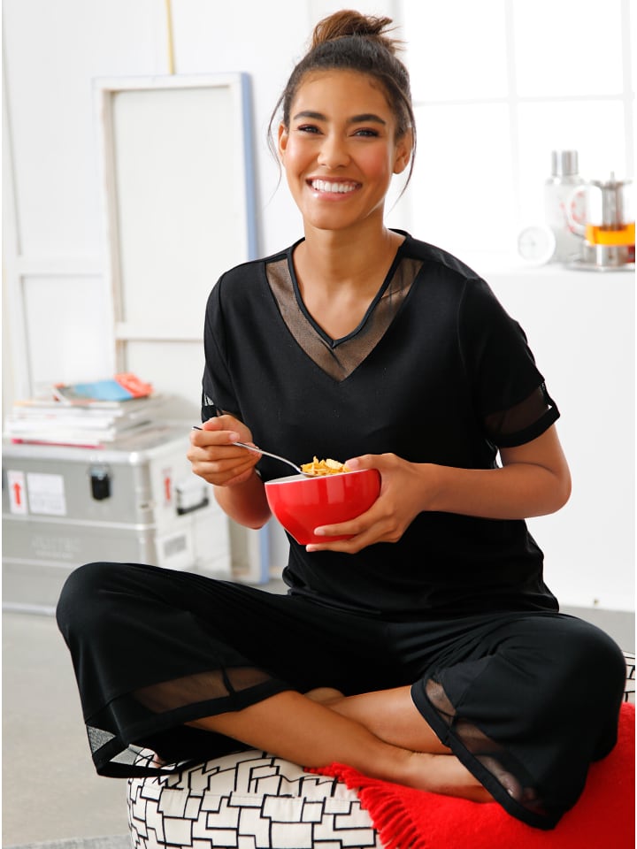 Привлекательная пижама со слегка прозрачными сетчатыми вставками в V-образном вырезе и на штанинах. Модные брюки длиной 7/8 имеют удобный эластичный пояс. Изготовлены из мягкого одинарного трикотажа.