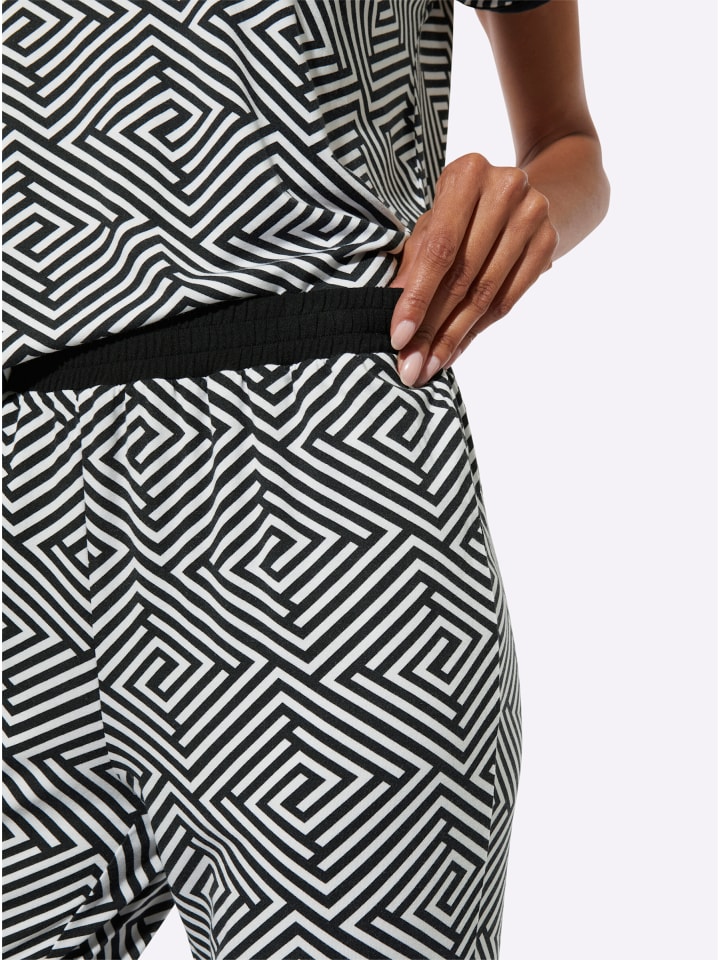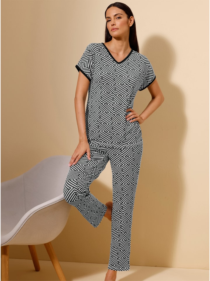 Модал делает мягкий, струящийся трикотаж еще более гладким и невероятно комфортным! Пижама от Wäschepur с современным графическим дизайном по всей поверхности. Однотонная окантовка на V-образном вырезе и коротких рукавах добавляет элегантности топу. Имеет приспущенные плечи. Длинные брюки с удобным однотонным эластичным поясом.