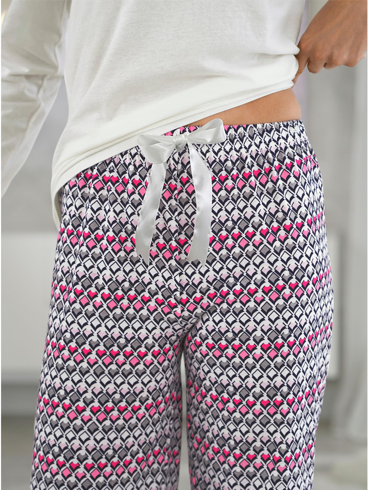 Образцовая! Пижама с привлекательным принтом на окантовке круглого выреза горловины с небольшим V-образным вырезом и планкой с имитацией пуговиц, а также на накладном нагрудном кармане с милым бантиком. Брюки с принтом имеют шнурок и декоративную отделку на удобном эластичном поясе и эластичных манжетах. Однослойный трикотаж.