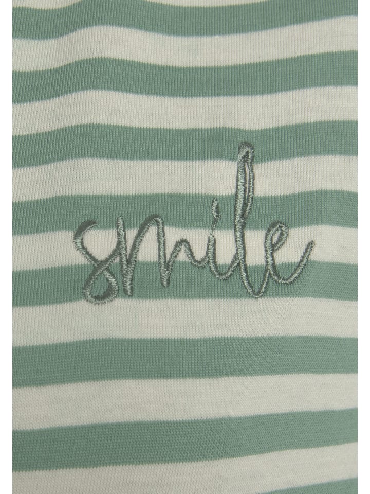 Футболка оверсайз от Vivance Dreams. С полосатым узором и ненавязчивой вышивкой. Удобный крой, короткие рукава реглан и круглый вырез. Мягкая хлопковая ткань одинарного трикотажа.