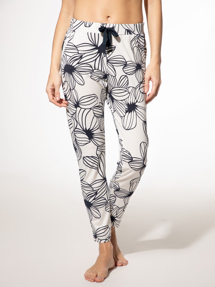 Эти длинные женские пижамные штаны кремового цвета с темно-синим цветочным узором впечатляют исключительно комфортной посадкой. Изготовленные из эластичного трикотажа из 95% хлопка и 5% эластана, они приятно мягкие на ощупь и обеспечивают достаточную свободу движений для хорошего ночного сна. Эластичный пояс украшен очаровательным декоративным бантиком. Штаны сужаются к низу, создавая облегающий, современный силуэт. Идеальная вещь для уютных ночей, одновременно удобная и женственная.