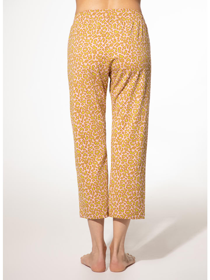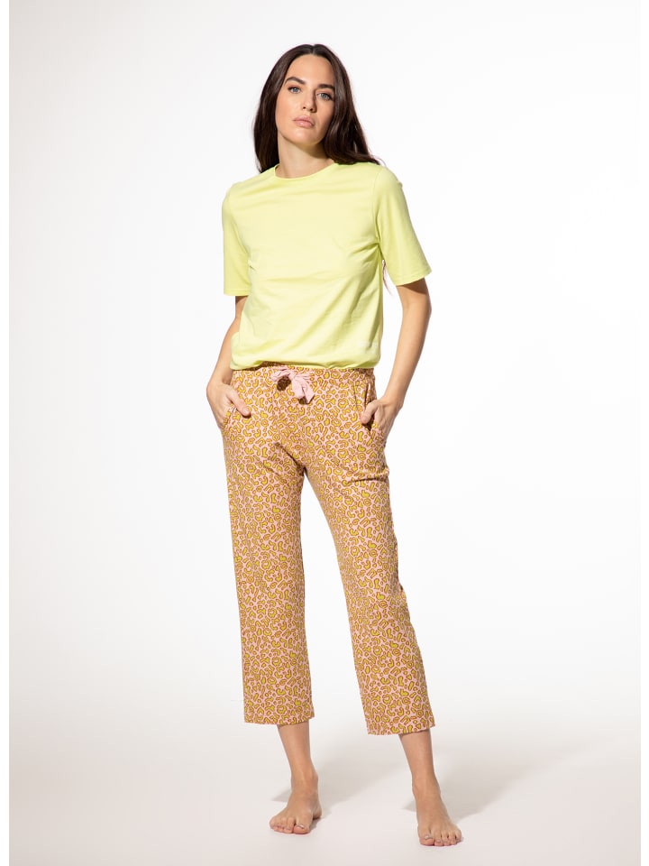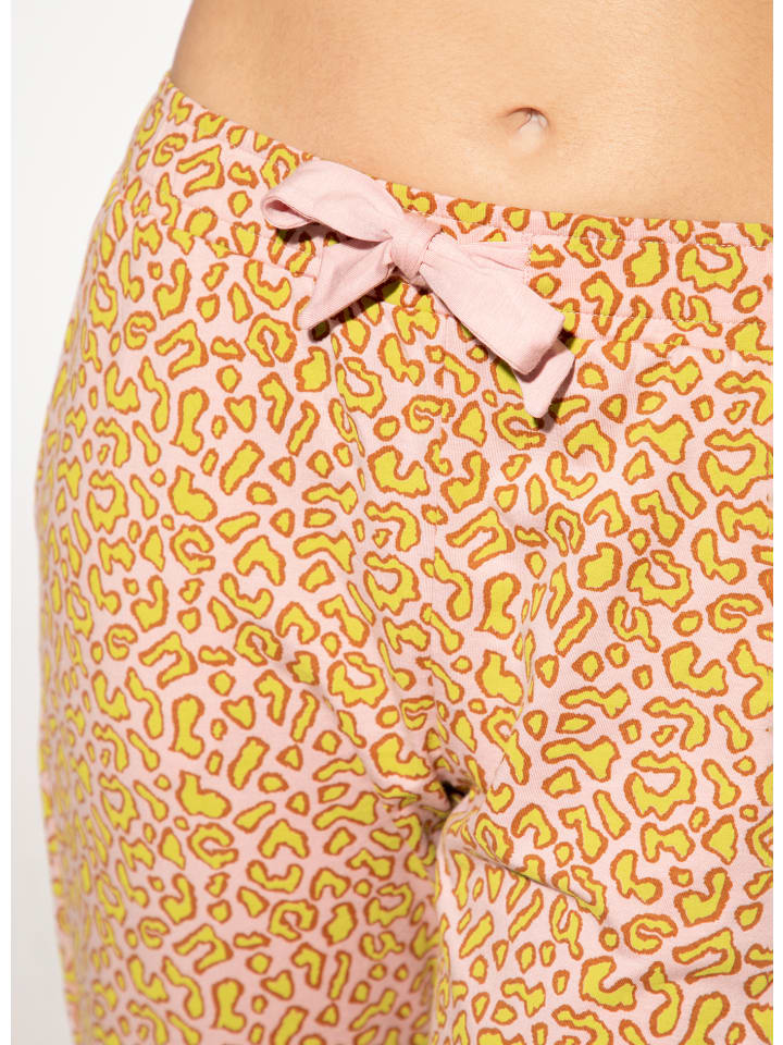 Эти пижамные штаны длиной 7/8 от SHORT STORIES привнесут свежий, яркий акцент в вашу домашнюю одежду благодаря эффектному леопардовому принту в розово-зеленых тонах. Прямой крой обеспечивает комфортную посадку, а эластичный пояс с декоративным бантиком добавляет дополнительный комфорт и элегантный акцент. Эти пижамные штаны сочетают в себе современный вид и максимальный комфорт! Незаменимая вещь для всех, кто любит быть модной и чувствовать себя уютно.