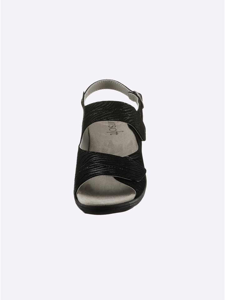 В тренде и невероятно удобны! Сандалии от Airsoft Comfort+ с тисненым, слегка мерцающим узором «зебра» на высококачественной гладкой коже. Внутренняя часть выполнена из искусственной кожи и дышащей микрофибры. Оснащены застежкой-липучкой и съемной стелькой - подходит для ортопедических стелек. Гибкая полиуретановая подошва с каблуком около 35 мм. Ширина В.