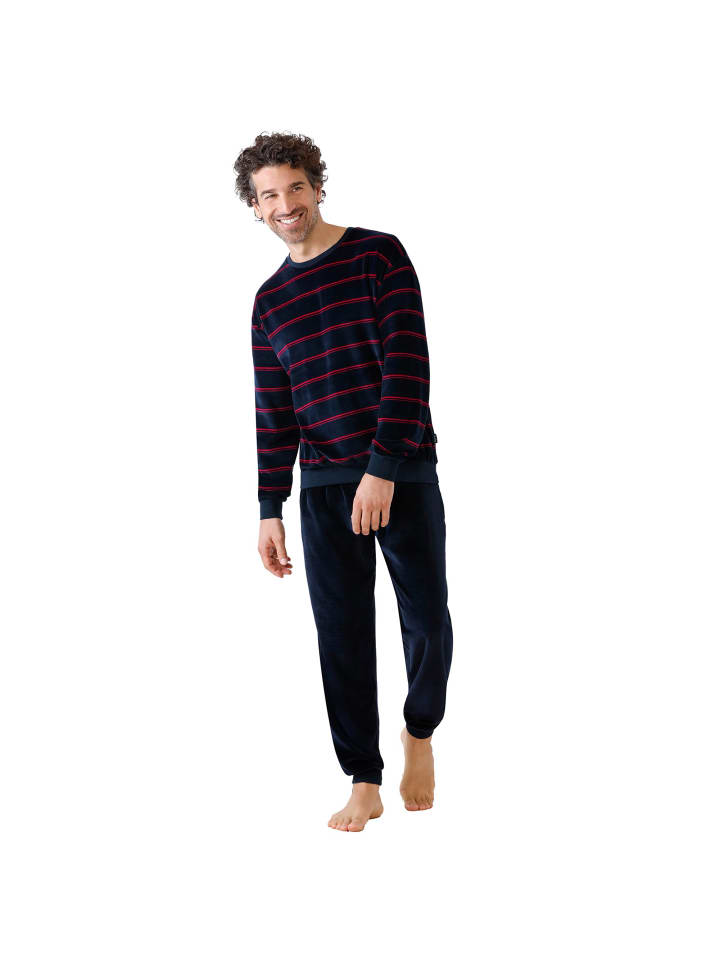 Мужская пижама hajo. Рубашка с длинными рукавами, круглым вырезом и манжетами. Длинные однотонные брюки. Пижама изготовлена из уютного велюра.