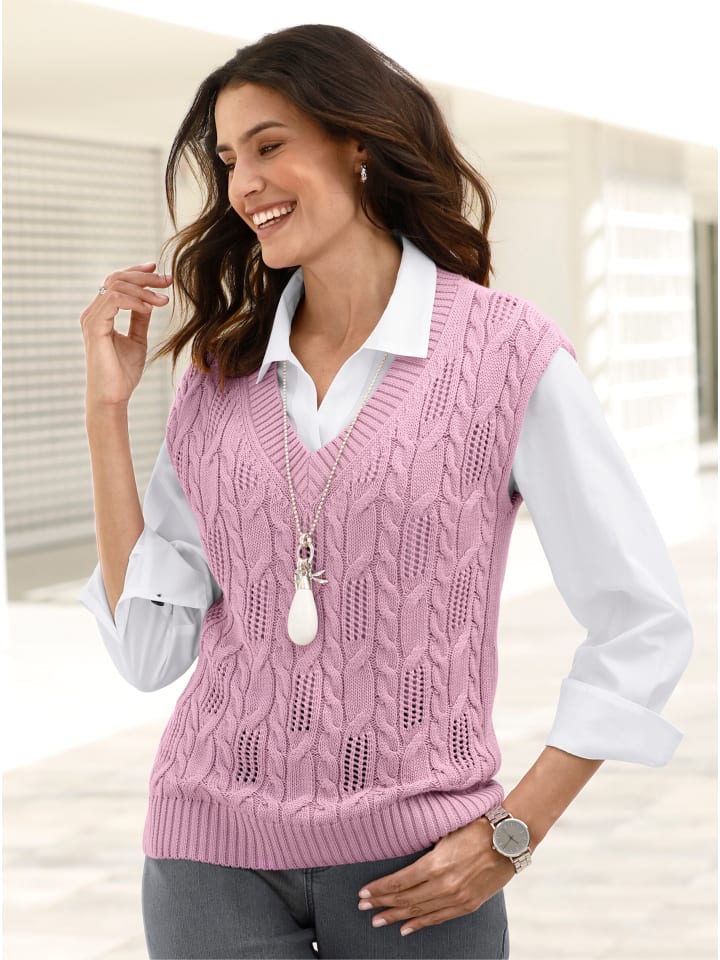 Жилет-пуловер со спущенными плечами, изготовленный из мягкой смесовой пряжи. Сочетание узоров из кос и ажурной вязки на передней части создает эффектный образ. Спинка связана из гладкой ткани. Проймы сохраняют свою форму. Ребристая вязка в области V-образного выреза и широкого низа со встроенной резинкой. Поддерживает инициативу «Хлопок, произведенный в Африке».