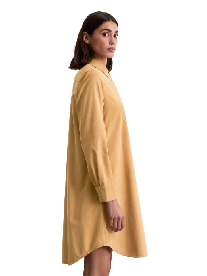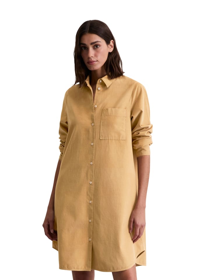 Лето и осень - лучшие сезоны для платьев. Абсолютная классика, которая всегда уместна и подходит как для спортивного, так и для элегантного стиля, - это платье-рубашка длиной до колена из высококачественного тонкого вельвета. С помощью простого приема стилизации платье мгновенно становится невероятно шикарным. Просто подверните воротник рубашки и слегка закатайте манжеты. Оно имеет свободный, расклешенный крой с воротником-стойкой, кокеткой на плечах, полной застежкой на пуговицы, складкой по центру спины и небрежно изогнутым подолом. Материал: легкий вельвет из тонкой смеси органического хлопка и лиоцелла.