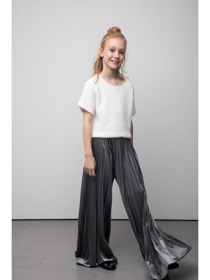 Откройте для себя элегантность и комфорт с этими серыми плиссированными бархатными брюками для девочек. Эти исключительные брюки сочетают в себе стильный внешний вид и комфорт, идеально подходящие для любого случая. Изготовленные из мягкого бархата, они дарят нежность и комфорт, а плиссированный крой добавляет легкости и элегантности. Элегантные плиссированные брюки. Серый цвет делает эти брюки универсальными и легко сочетающимися с другой одеждой. Длинные штанины и эластичный пояс гарантируют свободу движений и идеальную посадку, что делает их идеальным выбором как для особых случаев, так и для повседневной носки. Сертификация ECO 5 подтверждает, что продукт соответствует самым высоким стандартам безопасности и экологичности, что является дополнительным преимуществом для заботливых родителей. Выберите эти брюки, чтобы ваш ребенок чувствовал себя особенным и комфортным каждый день.