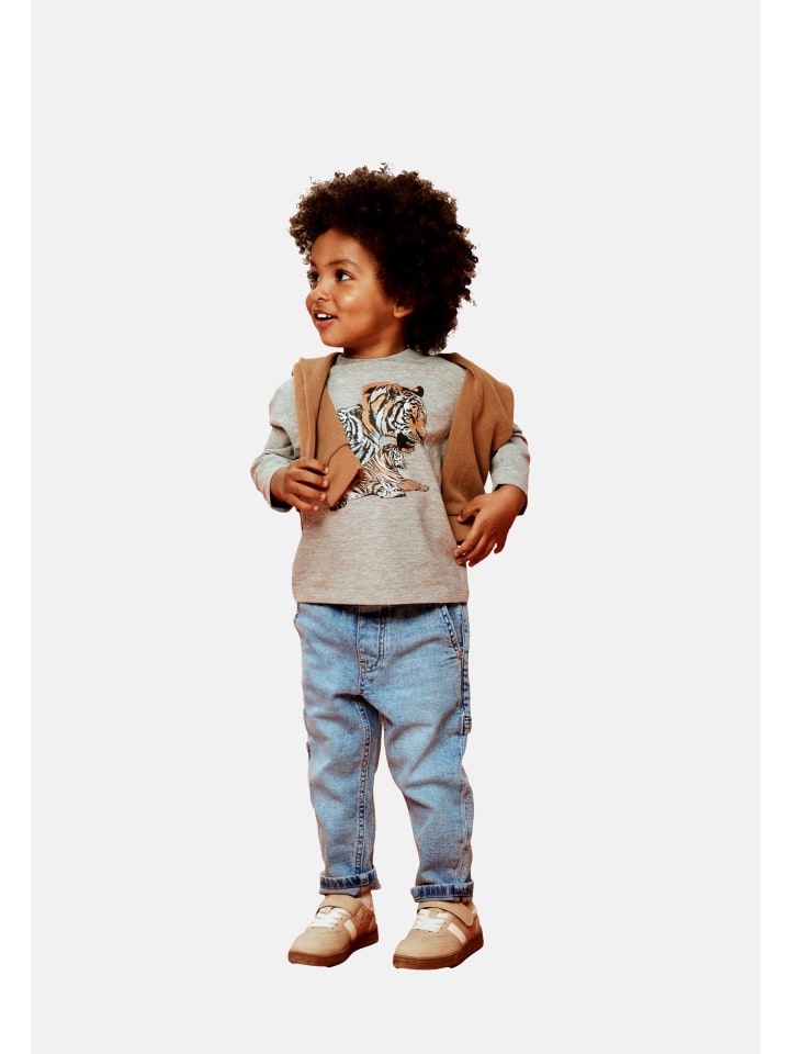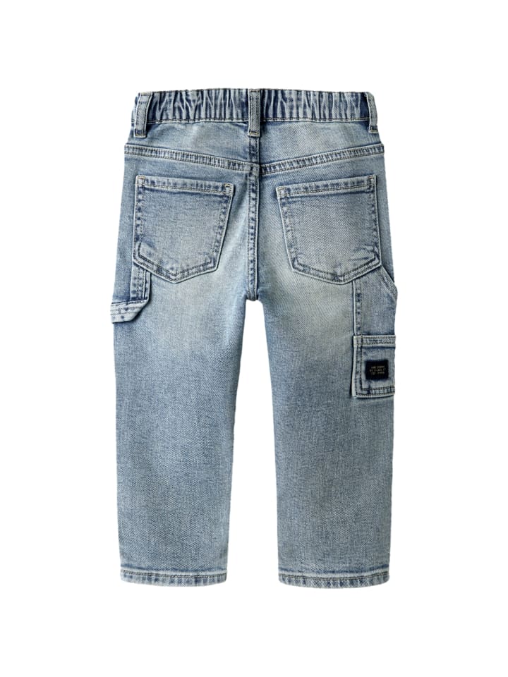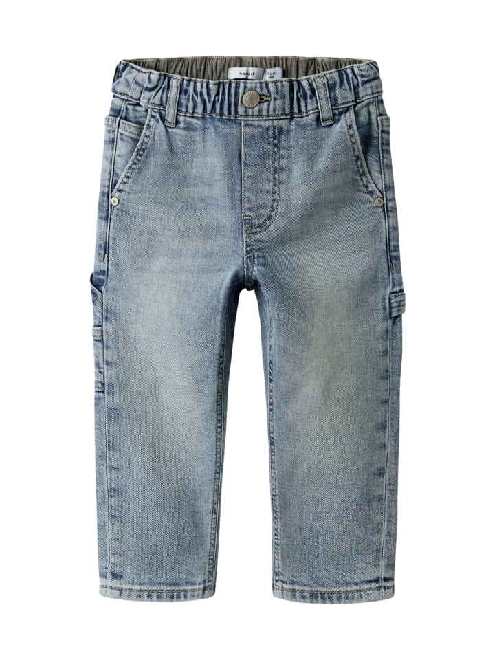 Эти джинсы сочетают в себе стильный рабочий образ и повседневный комфорт. Стандартный крой обеспечивает свободу движений и современный вид. Благодаря средней посадке на талии они сидят удобно и надежно. Классический стиль с пятью карманами придает им типичный джинсовый шарм. Легкие потертости добавляют аутентичный, модный штрих к любому образу. Шлевки для ремня и нашивка с логотипом идеально дополняют дизайн. Эластичный пояс облегчает надевание. Внутри регулируемая эластичная резинка с петлей для пуговицы обеспечивает надежную посадку. Эти брюки прочные, удобные и универсальные. Настоящая находка для всех маленьких искателей приключений.