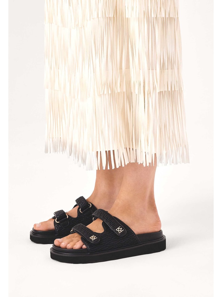 Черные мюли из высококачественной тисненой кожи - идеальное сочетание комфорта и элегантности. Их минималистичный дизайн, дополненный двумя широкими ремешками на липучках, идеально дополняет повседневный, но в то же время изысканный стиль. Золотистые монограммы KAZAR на концах ремешков добавляют нотку сдержанной роскоши, подчеркивая престижный характер мюлей. Анатомическая стелька обеспечивает комфорт, делая их идеальными для долгих активных дней. Толстая, прочная подошва придает мюлям современный вид, обеспечивая при этом стабильность и амортизацию, что делает их идеальными для повседневной носки.