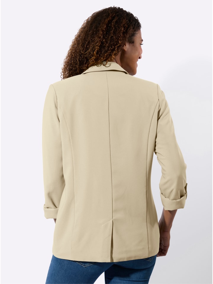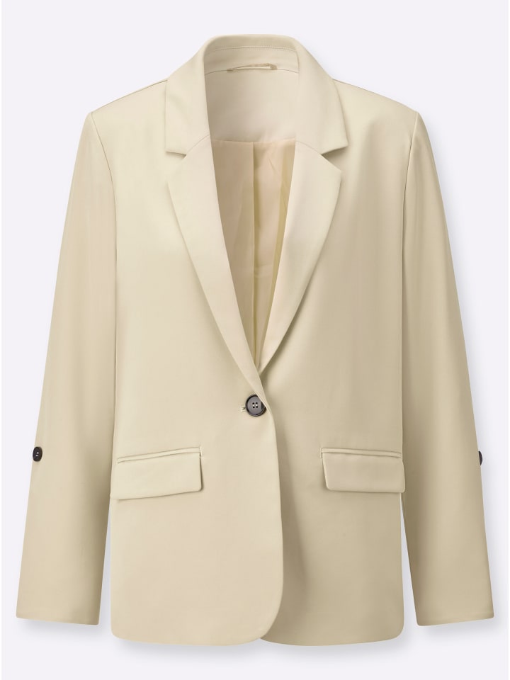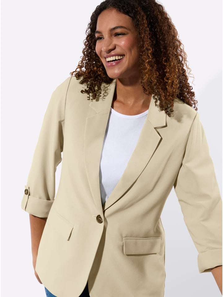 Всегда желанное дополнение к вашему гардеробу и приятное зрелище: простой в уходе и невероятно удобный блейзер, не мнется благодаря эластичной ткани. Имеет элегантный отложной лацкан, застежку на одну пуговицу и накладные карманы. Длинные рукава можно подвернуть до длины три четверти и закрепить пуговицей и хлястиком. Закругленные края по низу спереди, формирующие швы сзади с центральной шлицом. Модный аксессуар, привлекающий внимание как сам по себе, так и в сочетании с другими элементами гардероба. Не мнется благодаря эластану. Простая в уходе, удобная для путешествий ткань. Рукава можно подвернуть до длины три четверти. Накладные карманы. Универсальные варианты сочетания с другими элементами гардероба. Материал: 94% полиэстер, 6% эластан