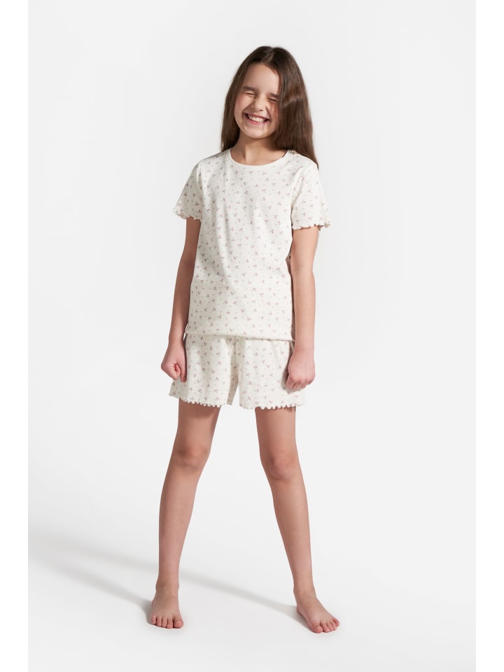 Детская пижама. Комплект из двух предметов для девочек, изготовленный из комфортного материала. Комплект состоит из футболки с коротким рукавом и удобных шорт. Принт по всей поверхности как футболки, так и шорт. Шорты имеют регулируемый пояс на шнурке. Материал: 95% хлопок, 5% эластан