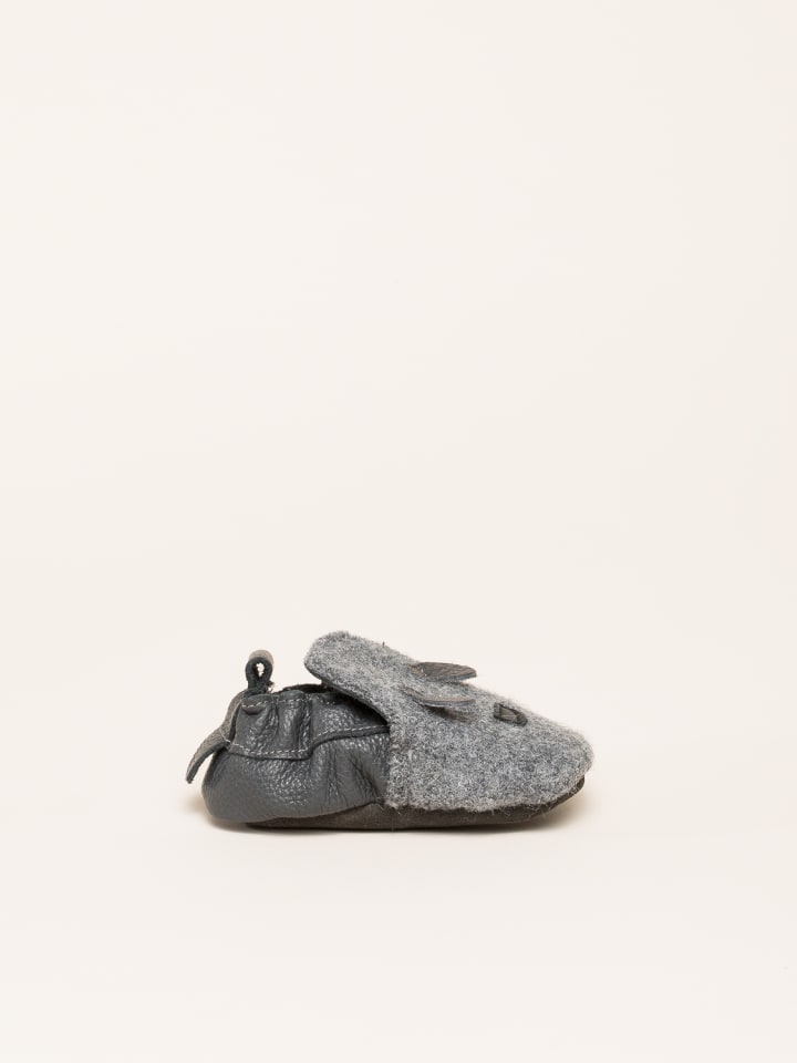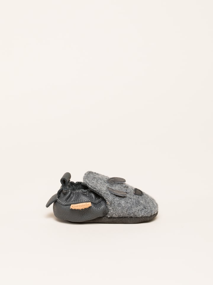 Шерсть и кожа в сочетании. Верх выполнен из 100% натуральной шерсти, обеспечивающей комфортный микроклимат для ног благодаря своим терморегулирующим свойствам. Эластичная лента между шерстью и кожей обеспечивает идеальную посадку и надежную фиксацию. Таким образом, ничто не помешает энергичным играм дома, в детском саду или в подготовительной группе. Доступны с различными аппликациями.