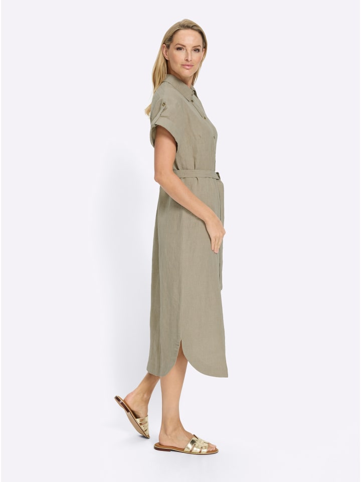 Платье из красивой смеси льна и хлопка с приспущенными плечами. Короткие рукава с фиксированной манжетой и хлястиком. Застежка на пуговицы спереди. Шлевки для пояса из подходящей ткани. Закругленный низ и боковые разрезы.