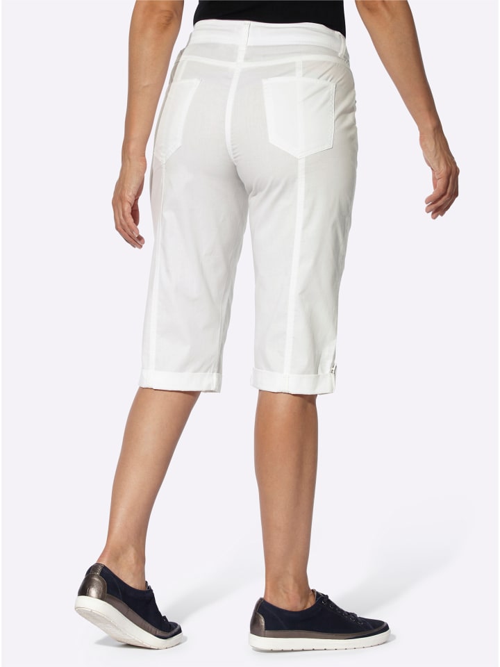 Для теплых дней года: шорты-бермуды из легкого хлопка с анатомическим поясом, петлями для ремня и застежкой на пуговицу и молнию. Два передних кармана украшены заклепками, а два задних - накладные. Приятная деталь: штанины можно подвернуть с помощью петель и кнопок. Швы визуально удлиняют штанины. Ширина штанины внизу около 50 см. Ремень в комплект не входит. Поддерживает инициативу «Хлопок, произведенный в Африке».