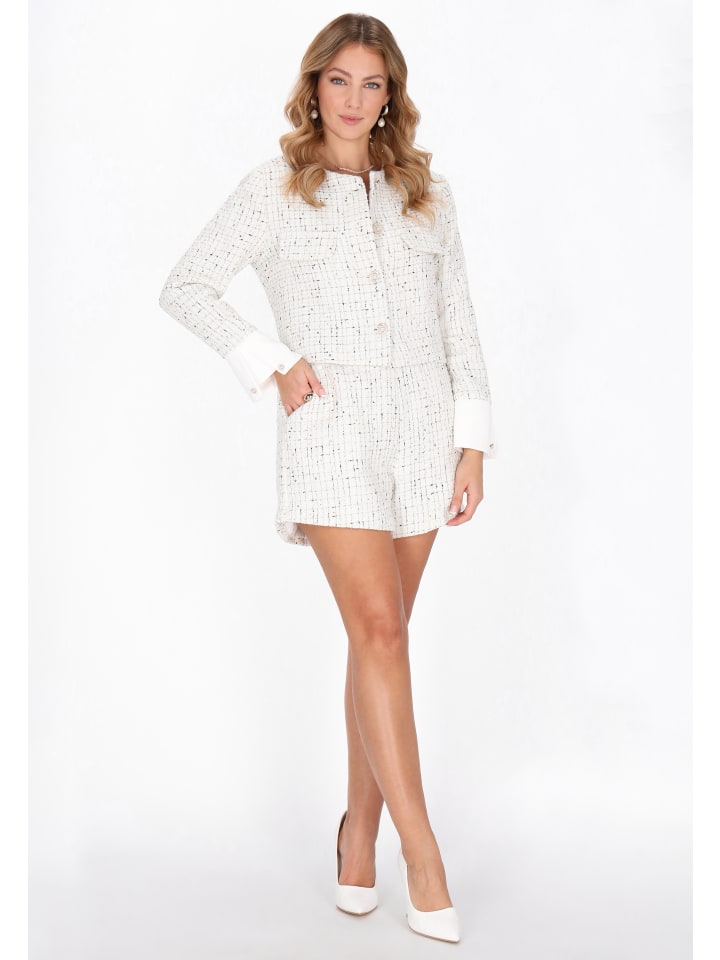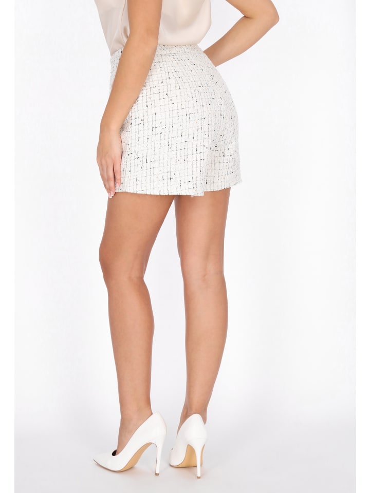 Стильные шорты с высокой талией из коллекции Faina, идеально подходящие для праздничных и особых случаев. Они имеют стандартный крой, застежку-молнию и практичные карманы, и изготовлены из элегантной букле-ткани. Пайетки, блестящая нить и фактурный клетчатый узор придают им роскошный, праздничный вид. Они идеально сочетаются с блейзером или элегантным топом, создавая шикарный, женственный ансамбль с ноткой блеска.