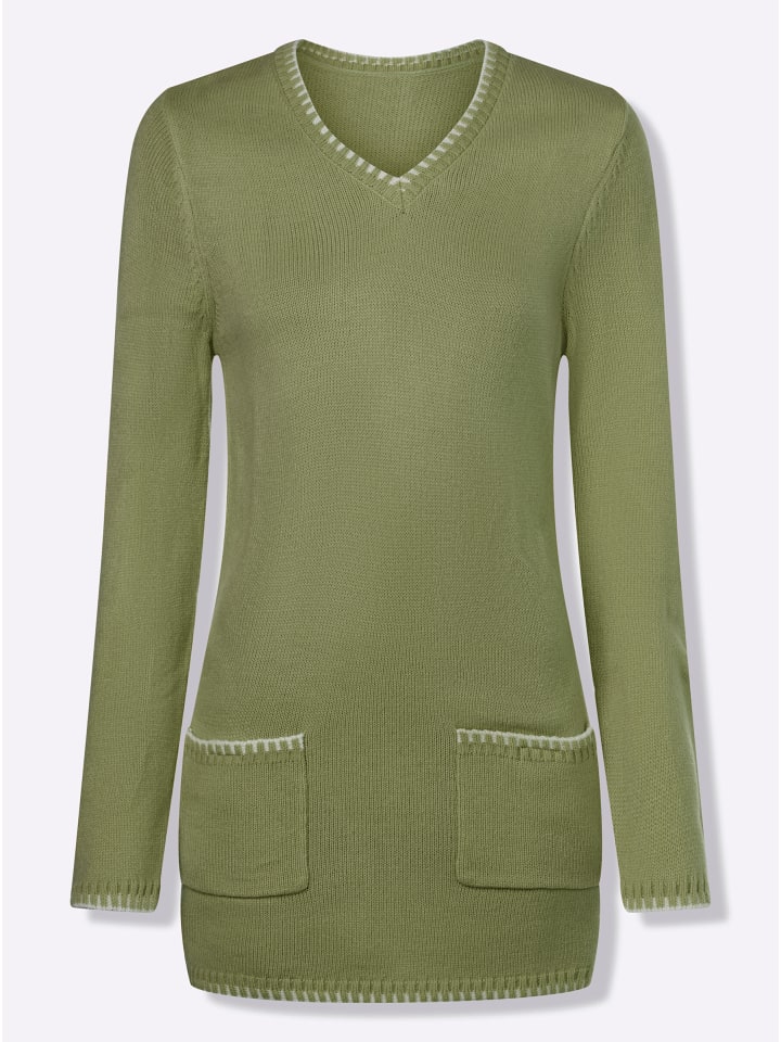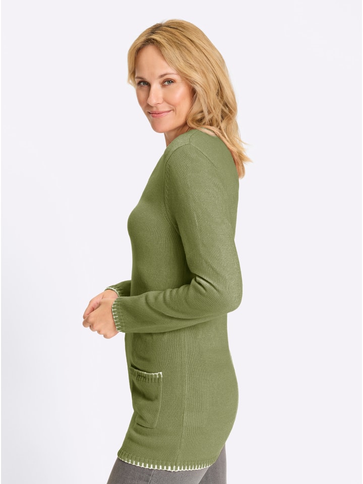 Особенность этого длинного свитера - контрастная ребристая отделка V-образного выреза, длинных рукавов, двух карманов и низа. - Лестный удлиненный силуэт - Контрастная ребристая отделка - Два накладных кармана Материал: 100% полиакрил