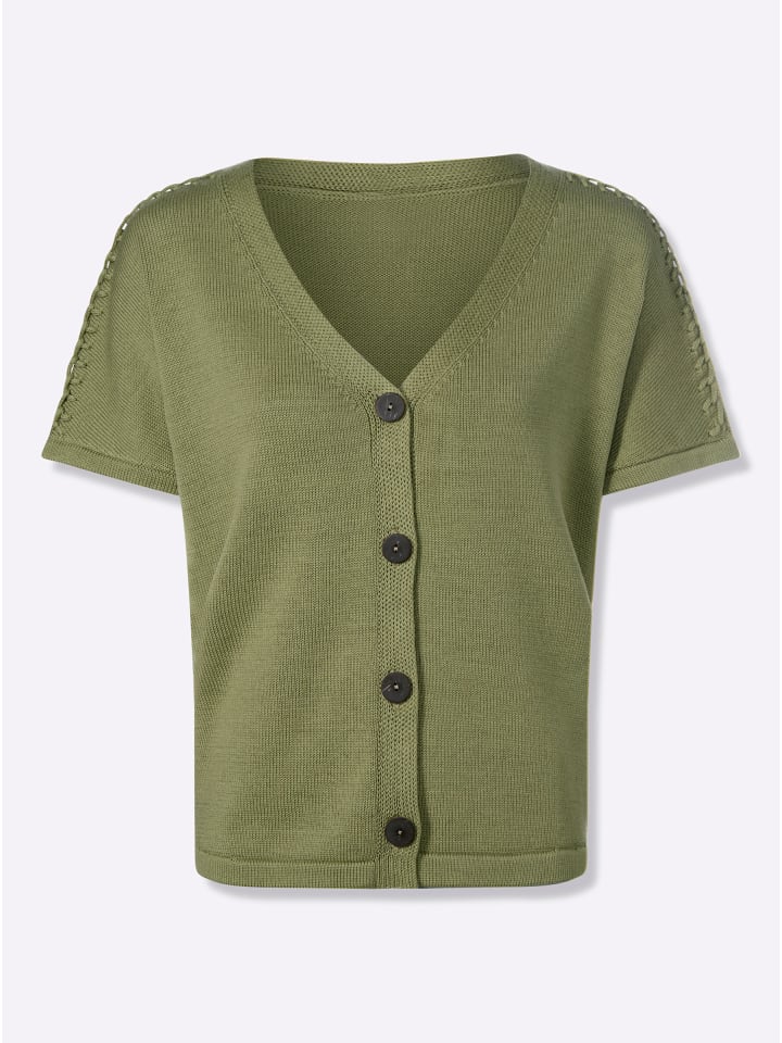 Универсальный кардиган свободного, расслабленного кроя с декоративной строчкой на плечевом шве. V-образный вырез, приспущенные плечи и короткие рукава. Застежка на пуговицы спереди. Поддерживает инициативу «Хлопок, произведенный в Африке».