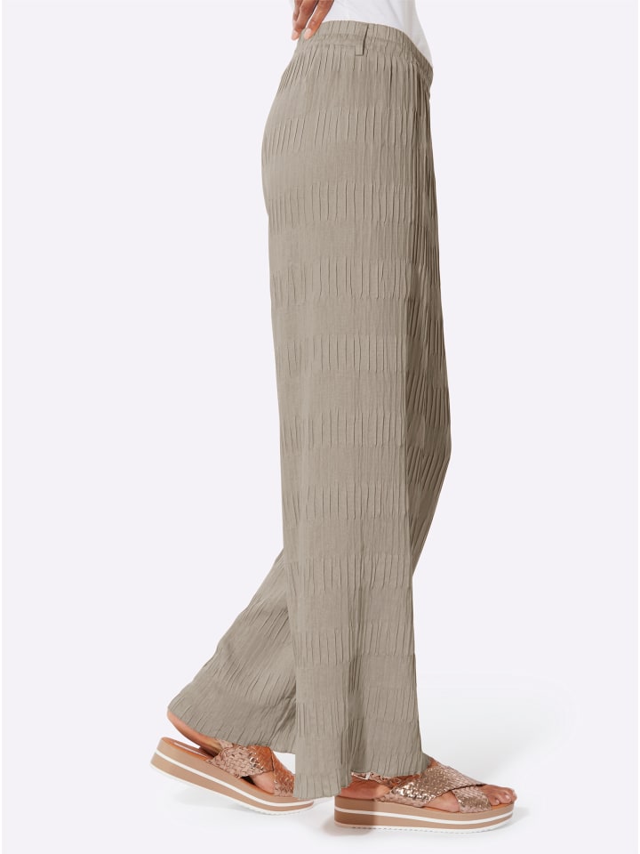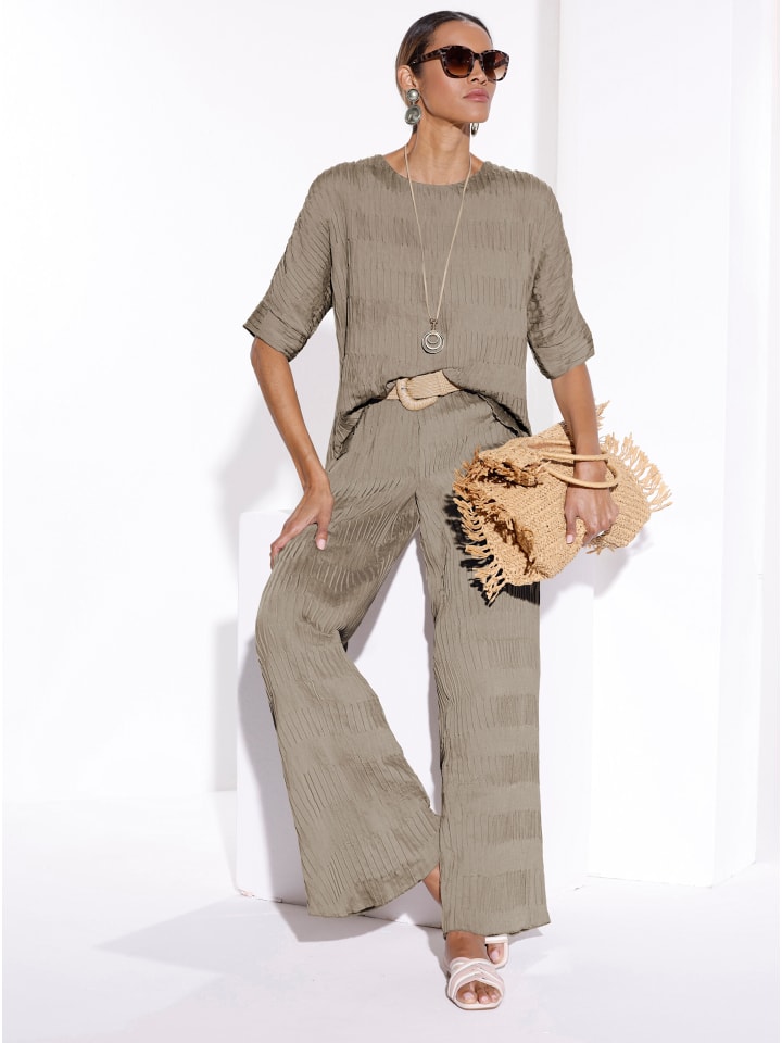 Впечатляет своей непринужденной элегантностью! Брюки с четко очерченным силуэтом и модными широкими штанинами. Удобный эластичный пояс и шлевки для ремня. Ширина штанины внизу около 62 см.