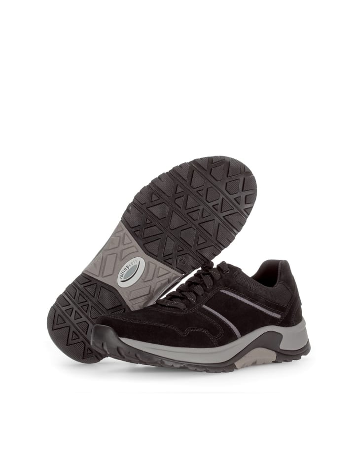 Спортивные низкие кроссовки Rollingsoft черного цвета - идеальный выбор для стильных мужчин. Верх выполнен из сочетания кожи и текстиля, что придает кроссовкам неповторимый вид. Модель оснащена съемной стелькой, которую легко заменить ортопедическими стельками. Чрезвычайно мягкая амортизация пятки, стабилизатор для контролируемого движения и изогнутая подошва для плавного перекатывания - отличительные черты кроссовок Rollingsoft от Gabor.