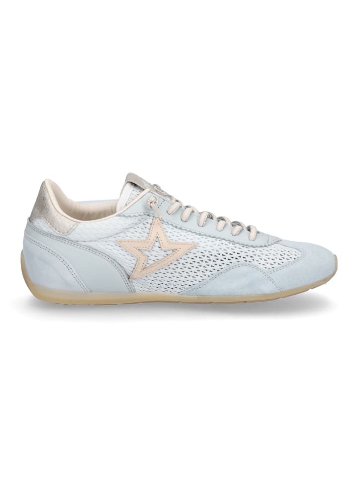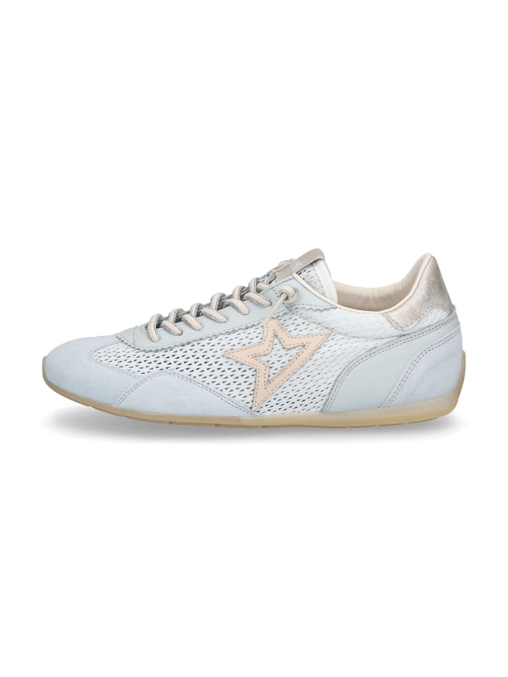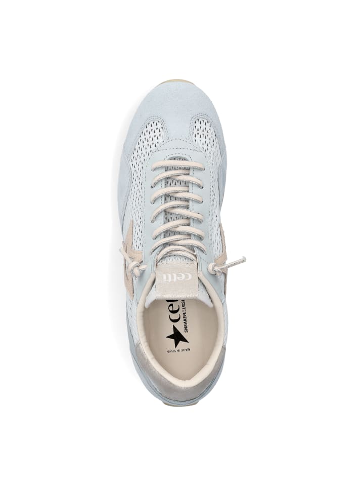 Женские кроссовки Cetti из светло-голубой гладкой кожи, замши и сетки со съемной стелькой из искусственной кожи, эластичными шнурками и резиновой подошвой.