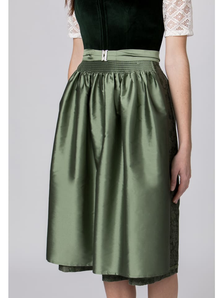 Дирндль «Верена» от Heimatgwand цвета пихты. Эта элегантная модель очаровывает своим эксклюзивным бархатом. Прямой мюнхенский крой создает очаровательное декольте. Стильный лиф застегивается на молнию спереди и завершает образ. Фартук в тон с простой брошью и юбка из изысканного жаккарда подчеркивают женственный силуэт. Абсолютная необходимость для каждой любительницы традиционной одежды. Идеально сочетается с кремовой блузкой-дирдлем "Laurene".