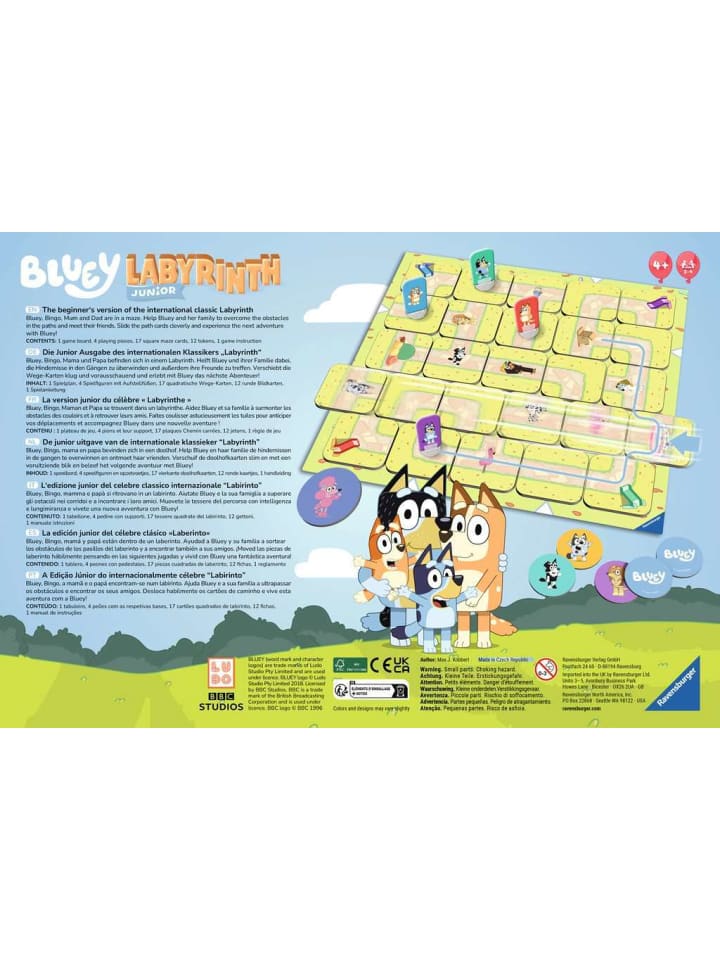 Блюи, любимая собака породы австралийская пастушья собака, которая превращает повседневную семейную жизнь в невероятные приключения, на этот раз заблудилась в лабиринте вместе со своей семьей и друзьями. Игроки пытаются добраться до своих любимых персонажей, меняя игровое поле с каждым ходом. Те, кто следит за всем, найдут пути к искомым персонажам и выиграют игру. «Лабиринт» - это игра с перемещением карточек, отличающаяся гениально простым игровым процессом, для детей от 4 лет и старше!