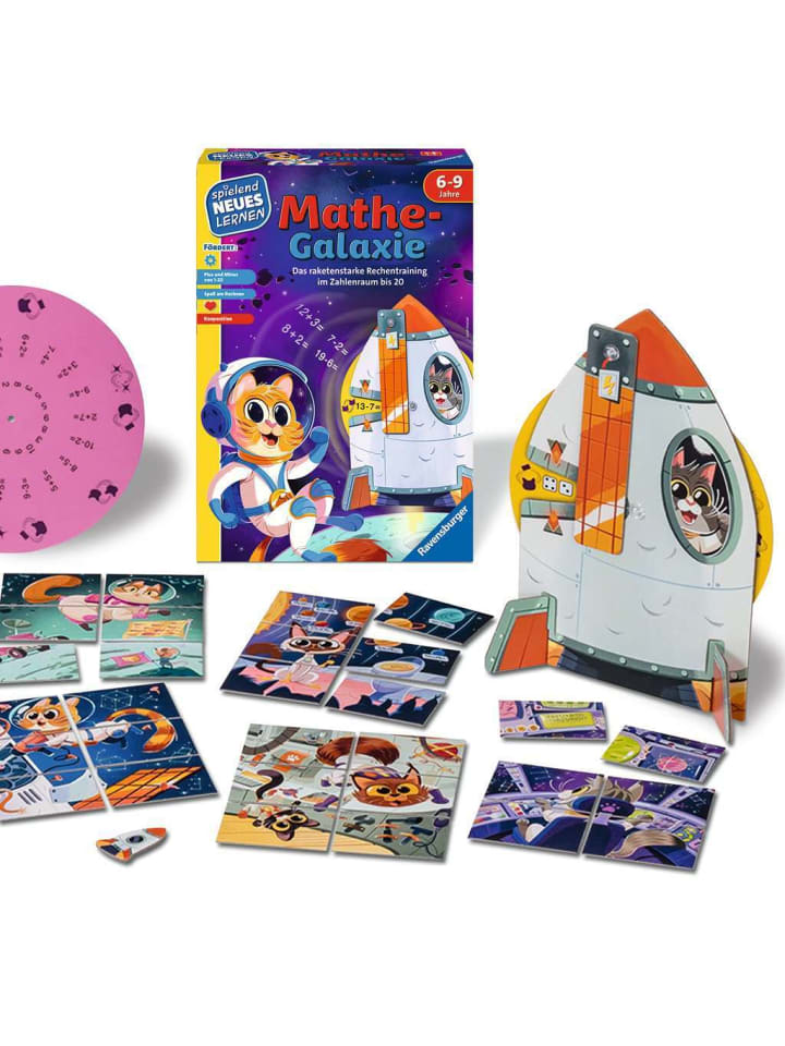 Математическая галактика привносит азарт и веселье в изучение математики: вращайте ракету, вычисляйте, проверяйте свой ответ и станьте первым, кто решит свою любимую головоломку «Кошки в космосе»! Математическая галактика сочетает в себе веселье и математику и может использоваться как в кооперативном, так и в соревновательном режиме. Благодаря привлекательному дизайну и многочисленным вариантам игрового процесса, это идеальный подарок для начала школьной жизни или для поддержки обучения. Эта игра предлагает детям разнообразную практику математики, которая расширяет их математические навыки и улучшает концентрацию. В зависимости от желаемого уровня сложности один из семи вращающихся дисков вставляется в трехмерную ракету. За каждое правильно решенное задание открывается новая карточка с пятью головоломками про космических кошек. Кто первым решит головоломку? В Математическую галактику можно играть как в кооперативном, так и в соревновательном режиме, а задания можно точно адаптировать к уровню знаний детей. Для простого знакомства дети могут сопоставлять количества и числа или складывать результаты бросков кубиков. Другие диски, например, позволяют практиковать сложение или вычитание до 10 или до 20.