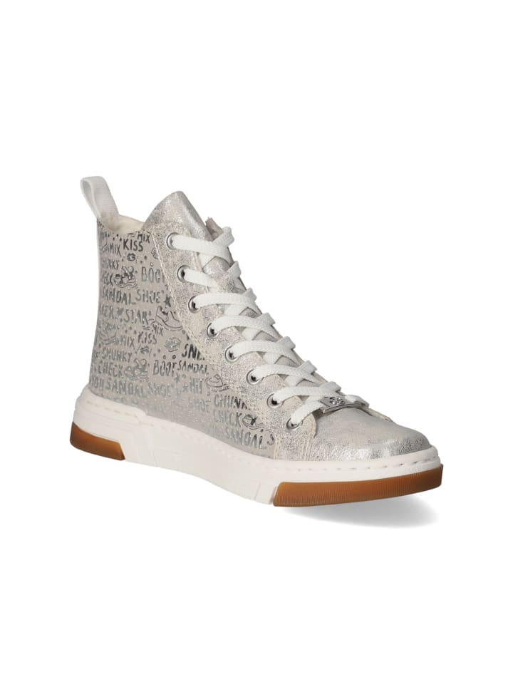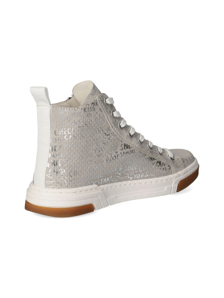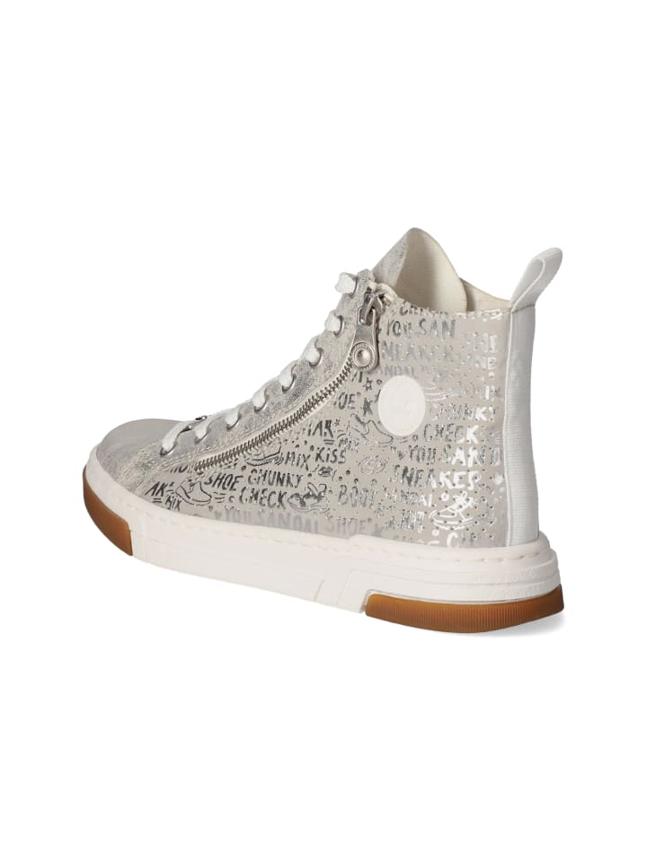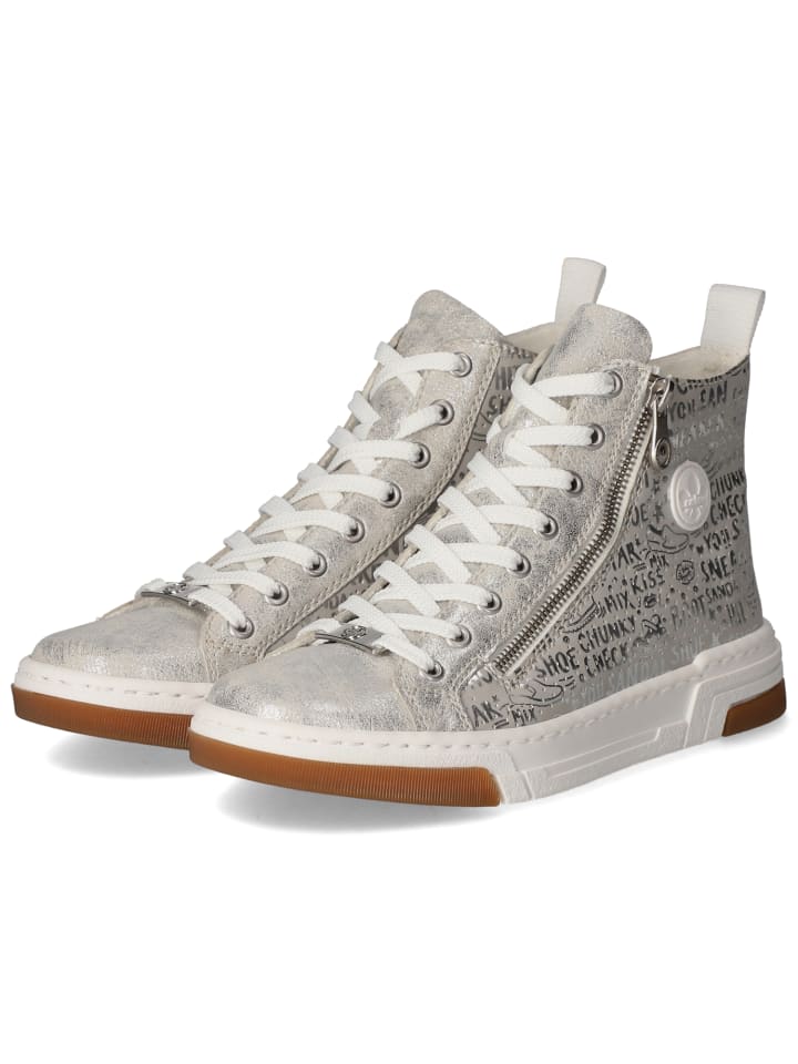 Кроссовки Rieker High Sneaker - стильный аксессуар с элегантной, переливающейся металлической серебристой отделкой. Закругленный носок и синтетический верх создают лаконичный силуэт, а шнурки и боковая молния обеспечивают удобство надевания и снимания. Съемная удобная стелька дополняет мягкую текстильную основу, обеспечивая приятные ощущения. Усиленная пятка обеспечивает устойчивость, а гибкая, цепкая подошва поддерживает каждый шаг. Напечатанный логотип сбоку добавляет городской стиль. Размер: соответствует стандартному. Совет по стилю: сочетайте эти туфли с черными узкими джинсами, элегантной водолазкой и эффектным пальто карамельного цвета для создания непринужденно-элегантного образа, оживленного металлическим блеском.