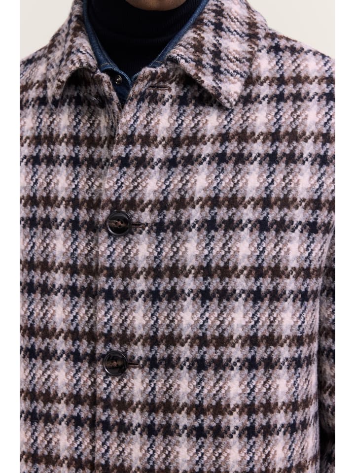 Это длинное пальто от Bugatti современного кроя позволит вам элегантно подчеркнуть свой классический стиль. Высококачественная шерстяная смесь с полиэстером и тонкими волокнами обеспечит вам комфортное тепло, а клетчатый узор добавит модный штрих. Классическая застежка на пуговицах в сочетании с отложным воротником придаст вам изысканный вид. Два просторных передних кармана и практичный внутренний карман обеспечат достаточно места для ваших повседневных вещей. Благодаря оптимальному крою пальто сидит комфортно и умело подчеркивает ваш мужской силуэт. Будь то офис или отдых - с этим универсальным пальто вы будете стильно одеты и прекрасно согреты. - Современный крой для вневременного, элегантного силуэта - Теплая шерстяная смесь с полиэстером и тонкими волокнами - Классическая застежка на пуговицах и отложной воротник - Практичные передние карманы и внутренний карман - Клетчатый узор для стильного вида Материал: - 60% шерсть - 30% полиэстер - 10% другие волокна