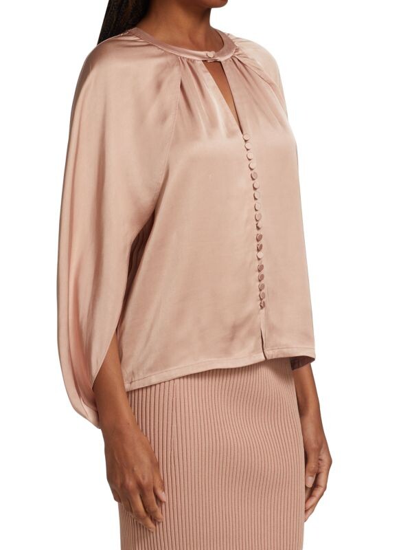 Элегантный атласный топ с рукавами-накидками, украшенными обтянутыми пуговицами и каплевидным вырезом спереди.