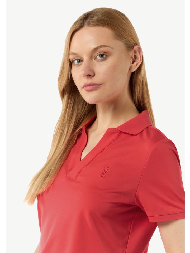 Непринужденный, женственный стиль: эта футболка с короткими рукавами из вискозной смеси подчеркнет вашу фигуру благодаря облегающему крою. Воротник-поло и боковой разрез по низу добавляют модный штрих, а V-образный вырез подчеркивает вашу женственность. Универсальная базовая вещь для повседневных образов.