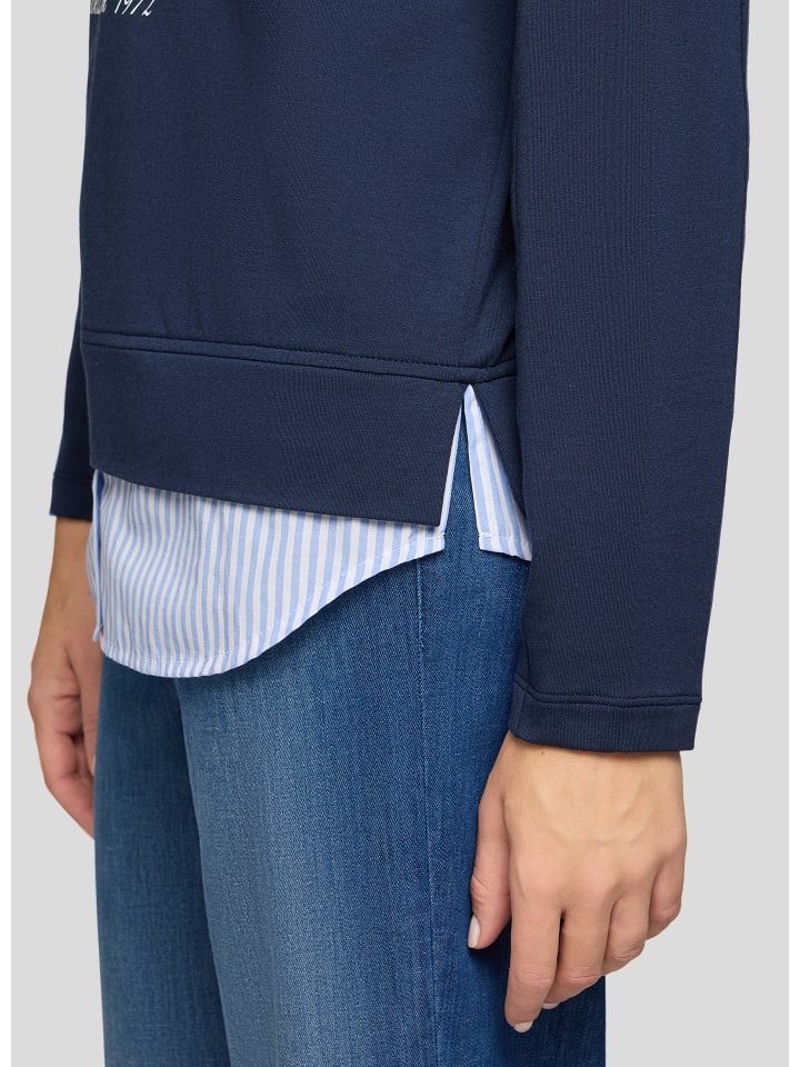 Эта толстовка отличается модным многослойным дизайном: вшитая полосатая вставка от блузки добавляет стильный штрих под глубоким V-образным вырезом. Принт спереди с надписью "Good Vibes Club" сочетает в себе различные стили принтов, придавая дизайну динамизм и характер. Боковые разрезы и свободный крой обеспечивают свободу движений и комфорт. Вшитая полосатая вставка от блузки. V-образный вырез с воротником толстовки. Декоративный принт спереди. Боковые разрезы по низу. - Толстовка с V-образным вырезом и вставкой от блузки - Смесь хлопка и модала - Детали блузки - Прямой крой - Рост модели 1,76 м, размер 38