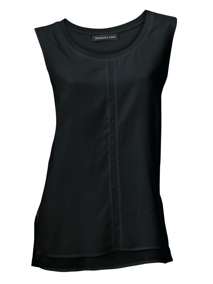 Рубашка-топ с эффектным многослойным дизайном: легкий трикотаж сверху, струящаяся ткань снизу. Лестный крой.