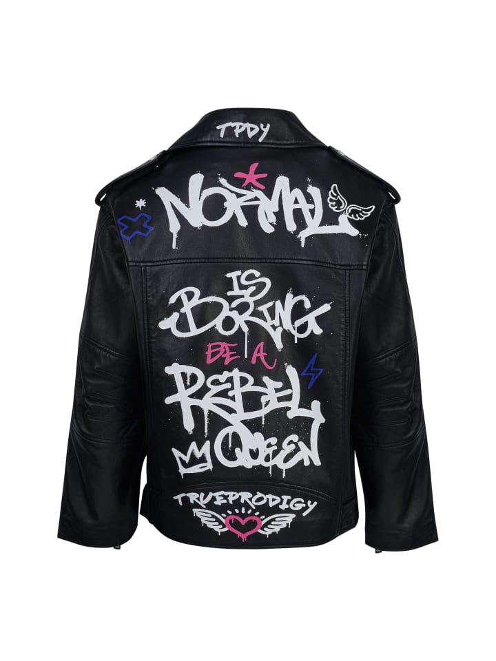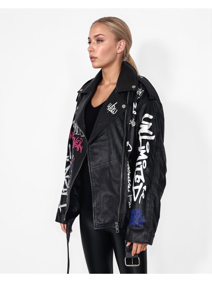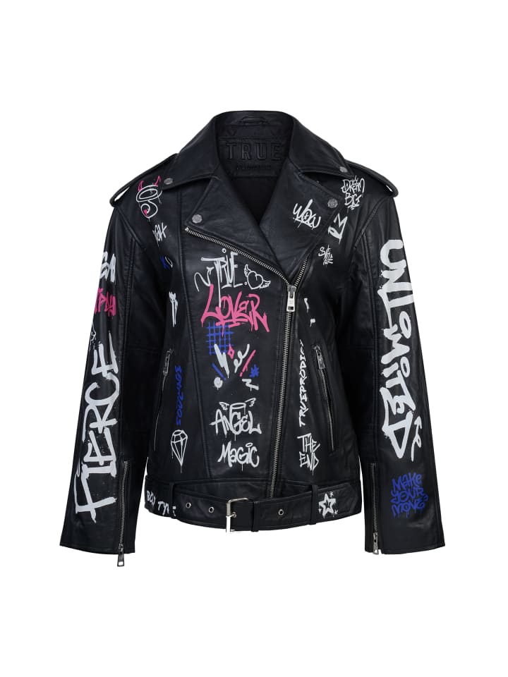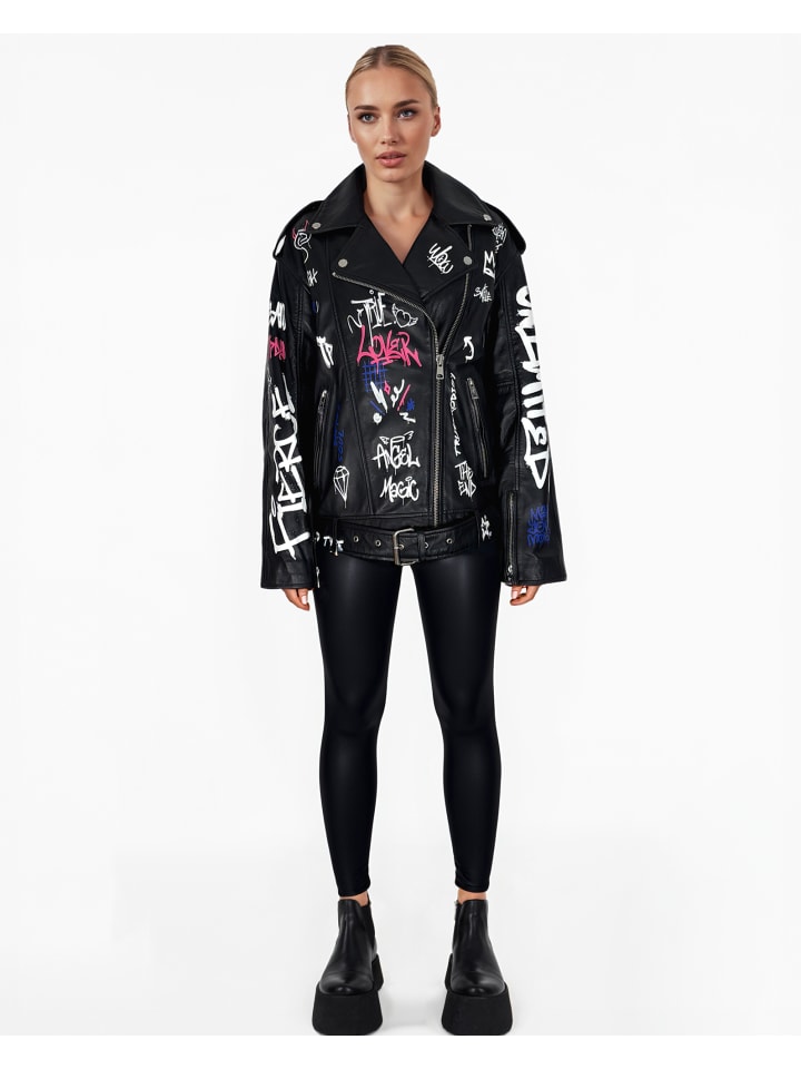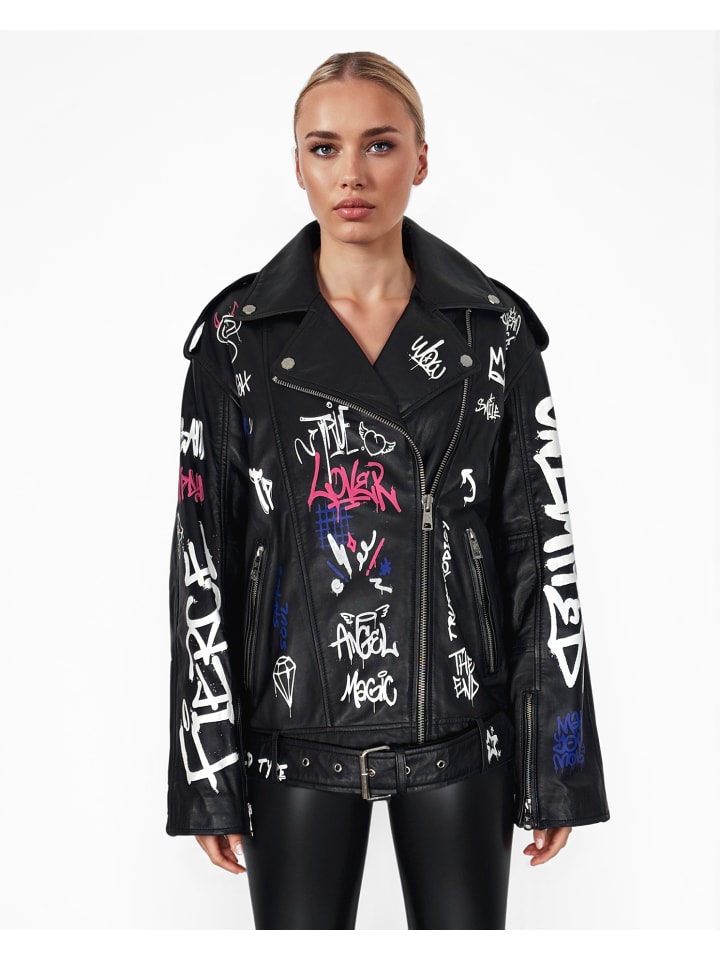 Наша женская кожаная куртка "Anya" с граффити уникальна и гарантированно привлечет внимание. Изготовленная из высококачественной овечьей кожи, эта куртка TrueProdigy украшена ярким принтом в стиле граффити, придающим ей панковский шарм. Стильный образ дополняют асимметричная молния, отложной лацкан и пояс в тон. Эта куртка - обязательный элемент вашего гардероба, который позволит вам выделяться, куда бы вы ни пошли.
