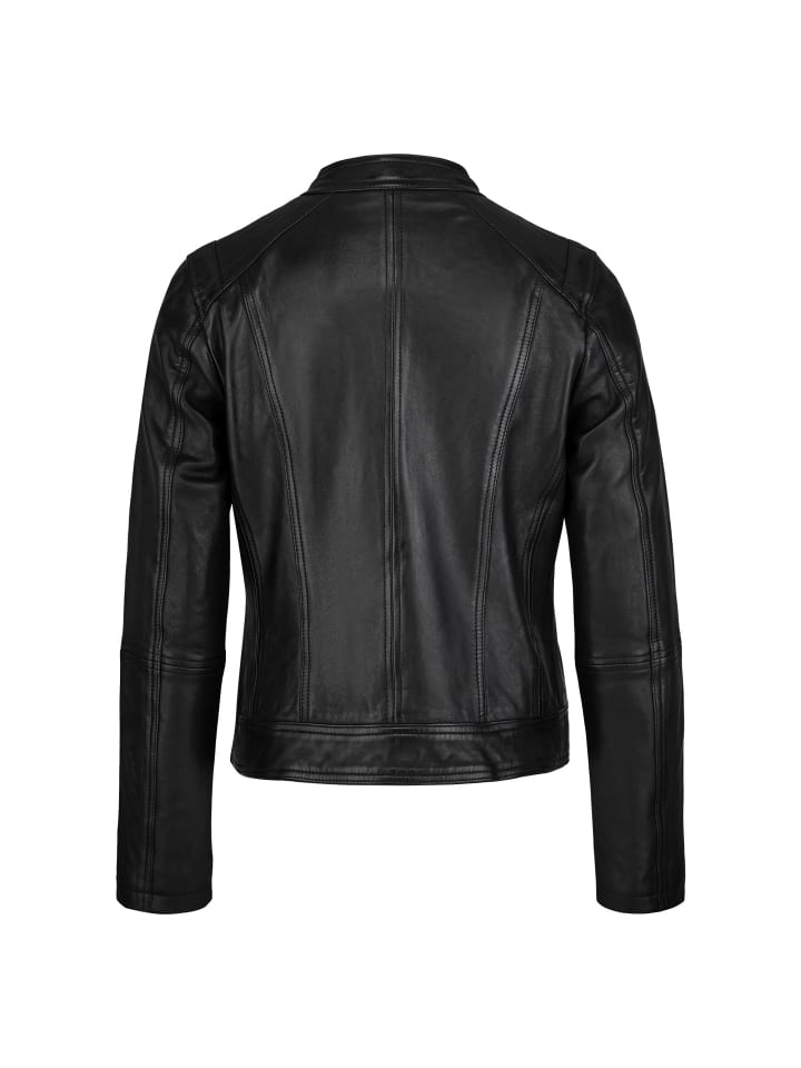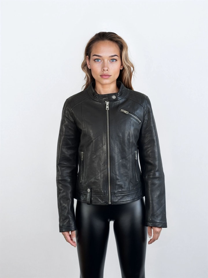 Женская кожаная куртка "Teona" с женственным силуэтом - незаменимый элемент вашего гардероба. Простой воротник-стойка с застежкой на кнопки и диагональный карман на молнии на груди создают спортивный образ. Изготовленная из высококачественной овечьей кожи, эта куртка имеет женственный, облегающий силуэт и декоративную строчку на плечах и спине.
