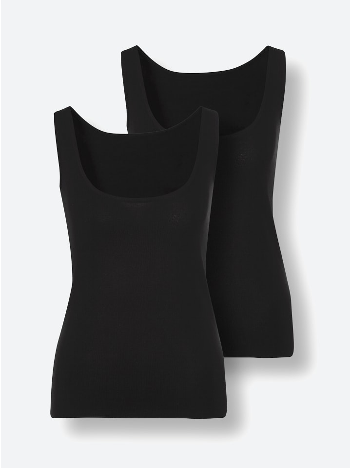 Двойная красота: две майки от Wäschepur с удлиненной спинкой - чтобы они хорошо сидели заправленными. Имеют круглый вырез горловины с кантом и плоский низ. Тонкая ребристая вязка.