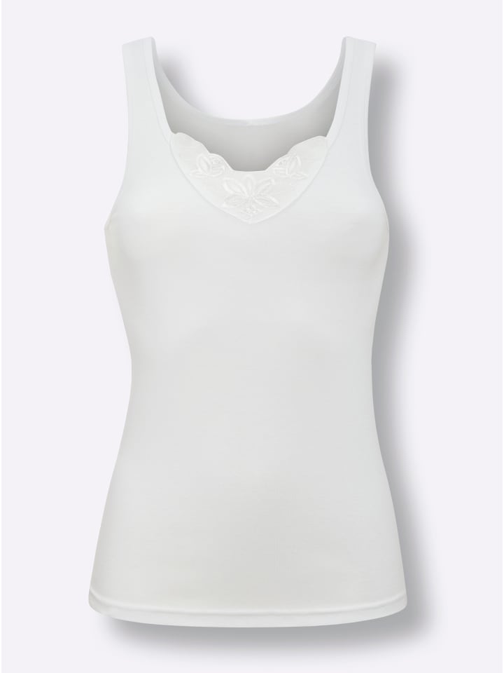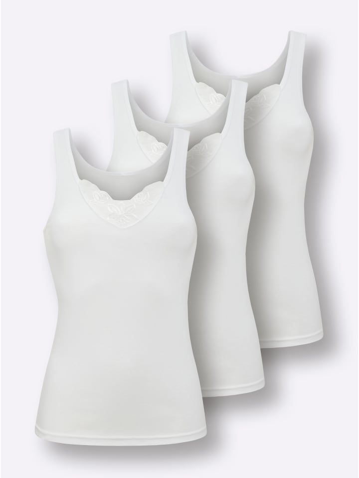 Эта приятная на ощупь майка от Wäschepur, изготовленная из тонкой ребристой вязки, продается в выгодном наборе из 3 штук. Она украшена небольшим мотивом батиста на V-образном вырезе и бесшовна по бокам. Сертифицирована GOTS.