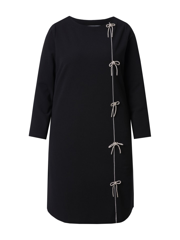 Платье А-силуэта из мягкого крепа с серебряными бантиками из страз. Вырез-лодочка, длинные рукава.