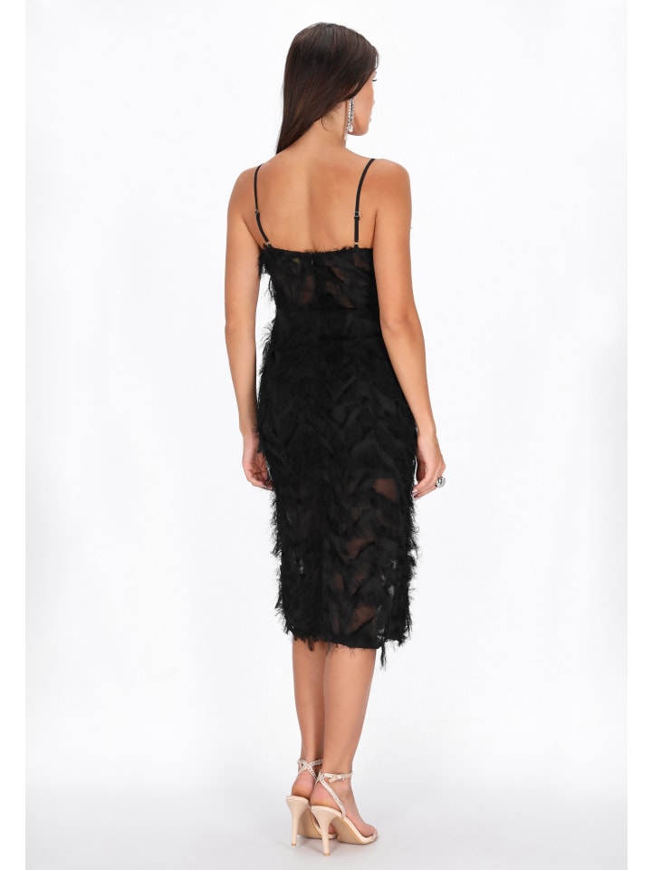 Элегантное и привлекательное платье миди облегающего кроя, идеально подчеркивающее женственный силуэт. Вырез в форме сердца прекрасно выделяет бюст, а регулируемые бретели обеспечивают идеальную посадку. Платье украшено легкой бахромой, добавляющей образу движения и легкости. Застегивается на молнию сзади и изготовлено из высококачественной тканой ткани с гладкой текстурой. Идеальный выбор для вечеринок, свадеб и вечерних мероприятий. Часть коллекции Fashion Look
