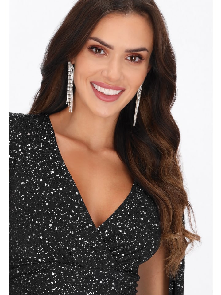 Чувственное и элегантное платье-халат облегающего кроя, идеально подчеркивающее фигуру и выделяющее ее достоинства. Мини-длина, глубокий V-образный вырез и длинные широкие рукава создают исключительно модный и женственный образ. Драпированная ткань с мерцающим блеском добавляет нотку элегантности и гламура. Изготовленное из мягкой трикотажной ткани, оно идеально подходит для вечеринок, приемов и торжественных мероприятий. Часть коллекции Fashion Look.