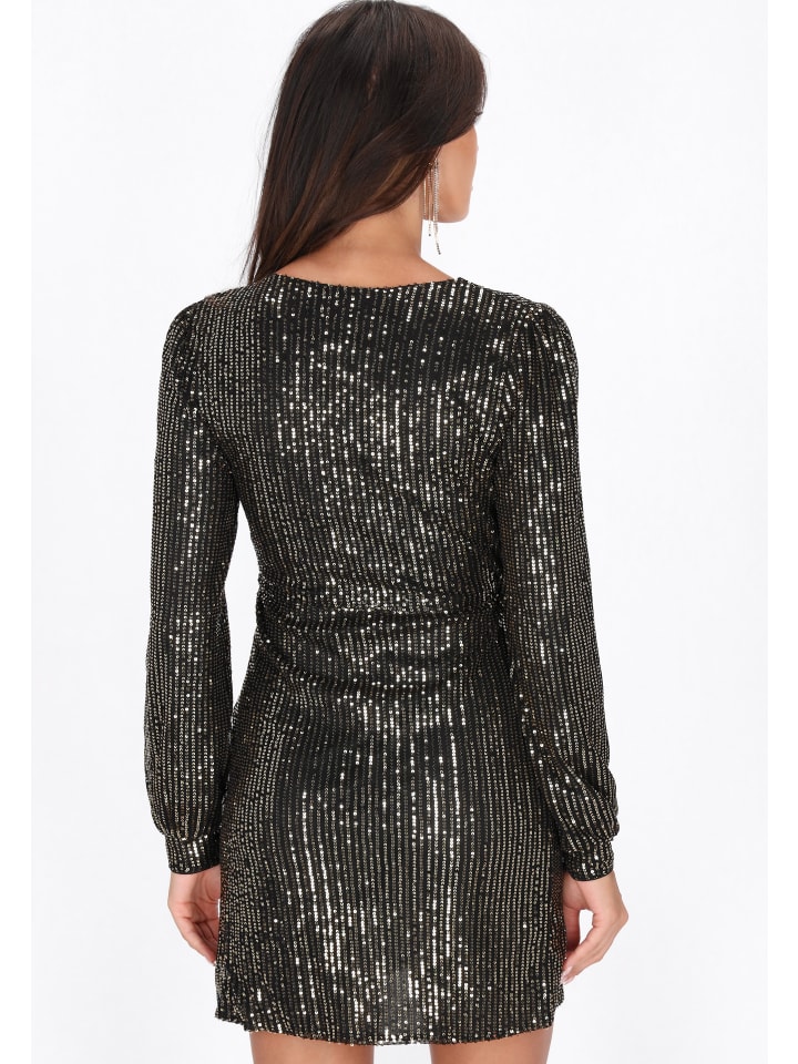 Эффектное платье-халат облегающего кроя, подчеркивающее женственный силуэт. Мини-длина и глубокий V-образный вырез добавляют чувственности образу. Модель с длинными рукавами выполнена из трикотажной ткани с сетчатыми вставками и украшена сверкающими пайетками, создающими искрящийся узор. Платье завязывается на талии для идеальной посадки и силуэта. Идеально подходит для элегантных вечеринок, мероприятий и вечерних выходов. Это платье из нашей коллекции Fashion Look.