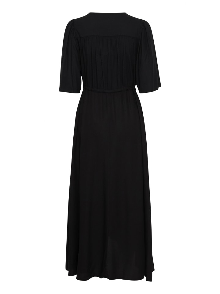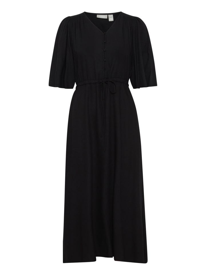 Черное платье миди с V-образным вырезом, застежкой на пуговицы спереди, поясом на талии, широкими рукавами до локтя и прямым силуэтом. Бережная стирка при 30°C, не отбеливать, не сушить в сушильной машине, сушить в подвешенном состоянии, гладить теплым утюгом (макс. 150°C), химчистка. Верхний материал: 100% вискоза. Особенности: V-образный вырез с застежкой на пуговицы, широкие рукава до локтя, пояс на талии, прямой крой, длина миди. Материал: 100% вискоза.