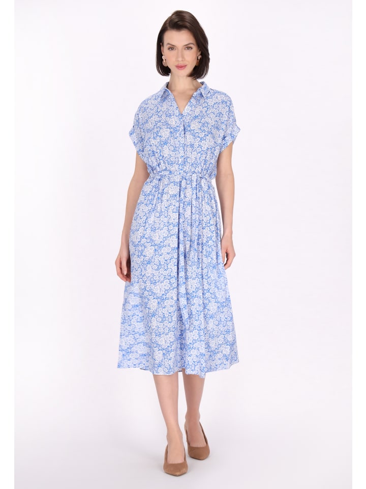 Это платье миди из коллекции Classic Look - элегантность в непринужденном стиле. Платье с V-образным вырезом и классическим воротником демонстрирует романтический образ. Короткие рукава и потайная застежка на пуговицы подчеркивают шик, а цветочный принт добавляет стильный штрих. Тканевый пояс подчеркивает талию, делая платье идеальным для любого случая.