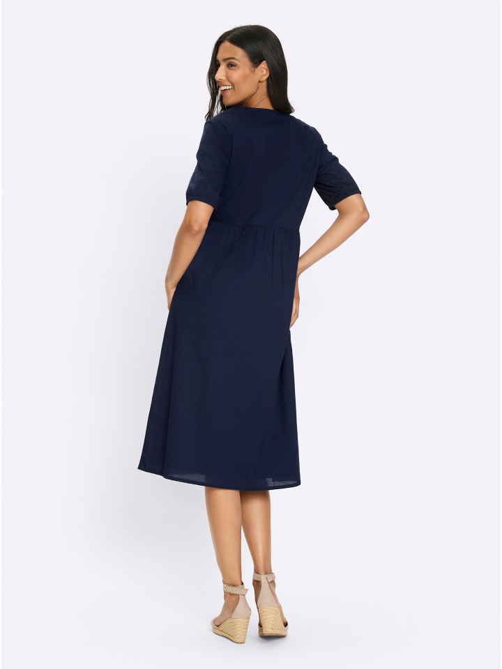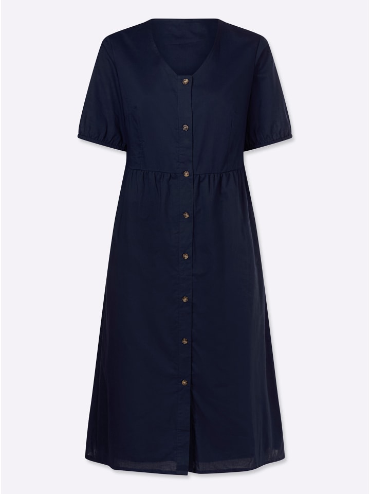 Это приятное для кожи платье станет вашим модным и удобным спутником в теплые дни. Оно имеет слегка округлый V-образный вырез и короткие рукава с эластичными манжетами. Вытачки на груди обеспечивают оптимальную посадку. Юбка расширяется благодаря присборенному шву на талии. Застежка на пуговицах позволяет регулировать степень декольте и длину ног. Полностью на подкладке.