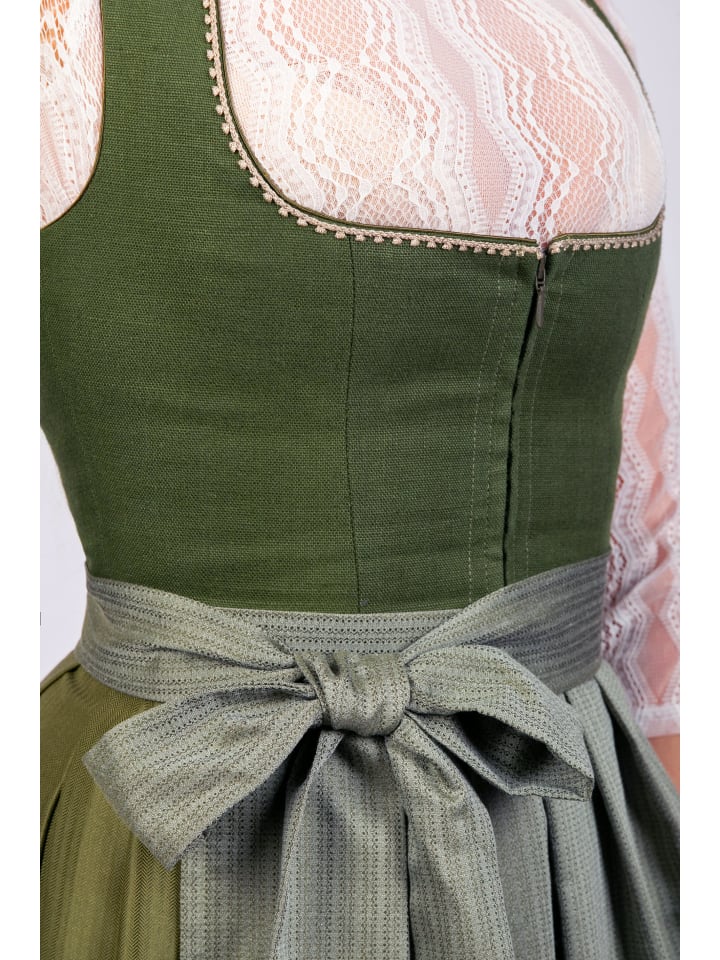 Дирндль Anni миди впечатляет идеальным сочетанием тончайших тканей, модных цветов и очаровательных деталей. Зеленый льняной лиф придает дирндлю приятную текстуру и обеспечивает отличную посадку. Вшитые швы на груди элегантно подчеркивают фигуру, а тонкая бежевая отделка на вырезе стильно завершает лиф. Слегка мерцающая юбка с тонким узором «елочка» подчеркивает утонченный характер этого дирндля и приятно ощущается на коже. Особое внимание привлекает фартук цвета шалфея с традиционным узором, который дополняет образ и делает дирндль элегантным и эффектным аксессуаром.